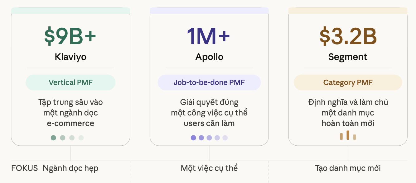 Klaviyo không cần PMF với mọi marketer. Apollo không cần PMF với mọi sales team. Segment không cần PMF với mọi công ty. Họ chỉ cần PMF cực kỳ mạnh với đúng người , những người họ đã chọn ngay từ khi định vị.