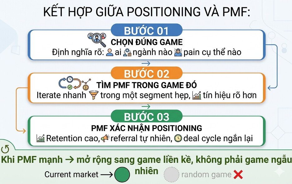 Positioning và PMF không phải hai bài toán tách rời. Đó là hai mặt của cùng một quyết định chiến lược: bạn chọn chơi game nào, phục vụ ai, và tạo ra loại giá trị không thể thay thế cho đúng người đó.