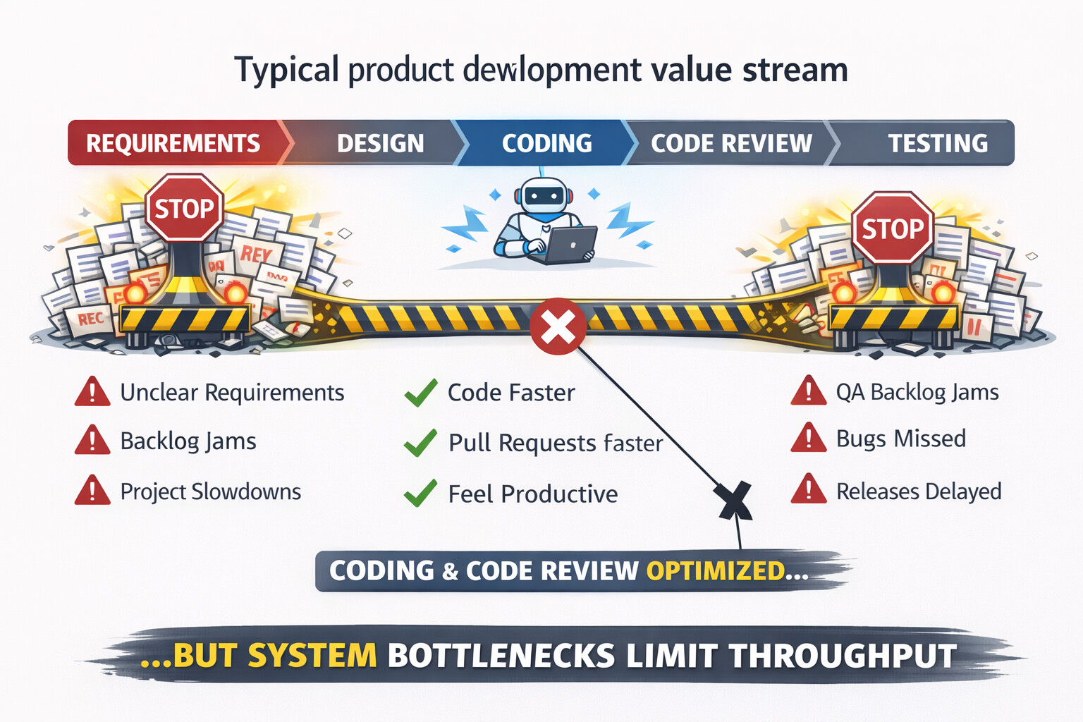 Nếu chúng ta dùng AI để biến khâu Coding thành một chiếc động cơ phản lực, nhưng khâu Yêu cầu đầu vào vẫn mơ hồ, hoặc khâu Kiểm thử đầu ra vẫn làm thủ công và chậm chạp, thì điều gì sẽ xảy ra? Code sẽ dồn ứ lại ở cửa ngõ Testing như một nút thắt cổ chai khổng lồ. Developer code xong quá nhanh nhưng phải ngồi chơi xơi nước chờ Review, hoặc tệ hơn, họ tạo ra một “núi” code tồn kho mà hệ thống không thể tiêu thụ kịp. Theo Thuyết Điểm nghẽn (Theory of Constraints), việc tối ưu hóa bất kỳ mắt xích nào nằm ngoài điểm nghẽn đều là một sự lãng phí tài nguyên.