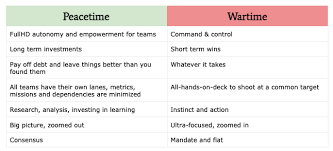 Ben Horowitz gọi hai trạng thái ổn định là Peacetime và trạng thái “cuồng hoá” là Wartime. Không phải chỉ là một phép ẩn dụ kích thích người nghe, mà còn để nhấn mạnh rằng: cách lãnh đạo, ra quyết định một cách hiệu quả trong peacetime có thể trở thành sai lầm chết người, quả tạ trong wartime và ngược lại.